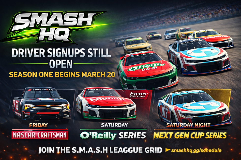 The S.M.A.S.H League — Sim Motorsports Association Series of Horsepower — is structured around a consistent weekend race schedule designed for drivers who work during the week but still want organized competition.